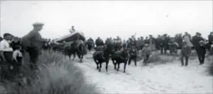 De reddingboot wordt met paarden door de duinen naar het strand getrokken.