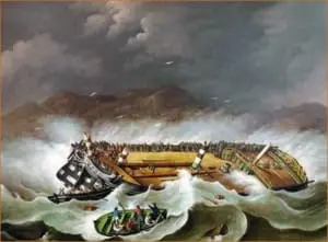 Het linieschip Zr. Ms. Wassenaar gestrand. Olieverf op paneel. Beide schilderstukken gemaakt door G.J. Heymel (1837) in opdracht van de Amsterdamse waterschipper Johannes Adolfse, die als bemanningslid van de Wassenaar de stranding had meegemaakt. (In bruikleen bij het Reddingmuseum, met toestemming van C.F. Adolfse)