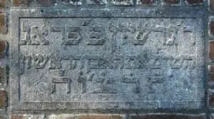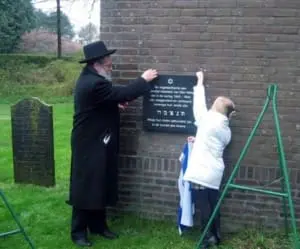 Hoofdrabbijn Benyomin Jacobs onthult samen met Noa Coltof in 2005 de gedenksteen aan de achterzijde van het metaarhuis.
